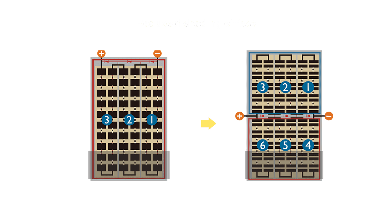 - 结合半切电池,,,降低遮阴影响、、、提升模组抗隐裂能力、、并减少电阻损耗,,,进一步提升模组发电效能。。